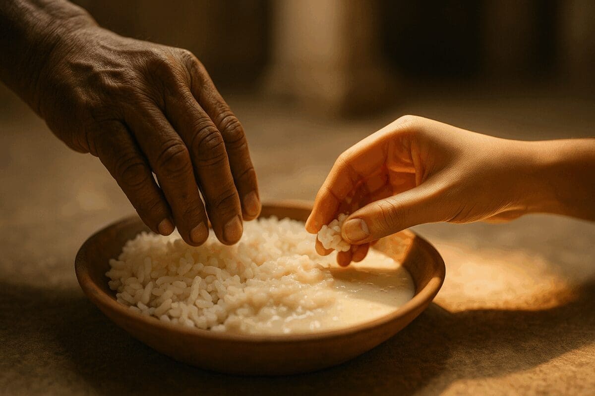 (Image Recommendation: ଦୁଇଟି ହାତର ନିକଟତମ ଚିତ୍ର (ଗୋଟିଏ ବୟସ୍କ, ଅନ୍ୟଟି ସୂକ୍ଷ୍ମ ଭାବରେ ଉଜ୍ଜ୍ୱଳ) ଏକ ସରଳ ମାଟି ପ୍ଲେଟରୁ ଖାଦ୍ୟ ବାଣ୍ଟୁଛନ୍ତି, ବୋଧହୁଏ ଚାଉଳ ଏବଂ କ୍ଷୀର। ଧ୍ୟାନ ବାଣ୍ଟିବା, ନମ୍ରତା, ଏବଂ ଭୋଜନର ଆଧ୍ୟାତ୍ମିକ ମହତ୍ତ୍ୱ ଉପରେ ରହିଛି।)
