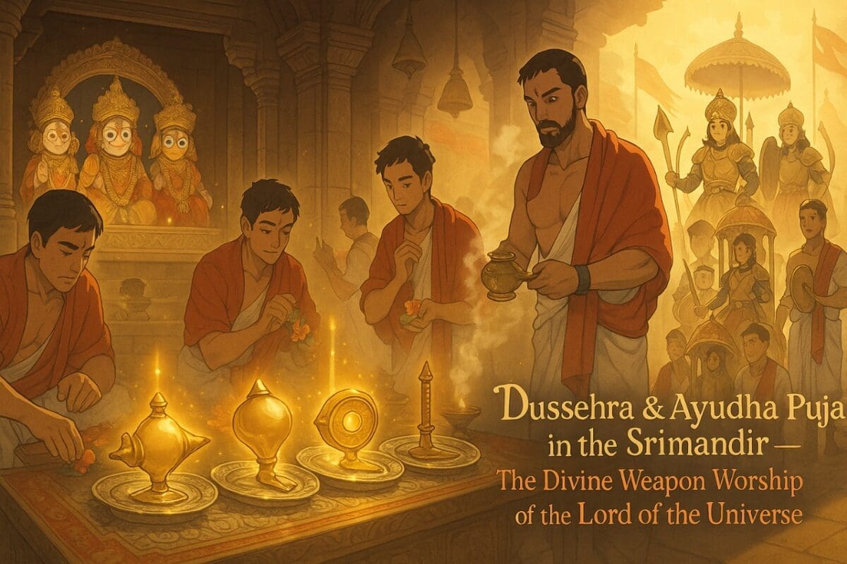 Today, after the completion of theΒ AbakashaΒ (morning ablution) ritual, sandalwood paste is applied to the three deities (Tini Bada). Following this, they are adorned with new clothes and specific ornaments, which constitutes theirΒ RajabeshaΒ (Royal Attire). After theΒ GopalaballabhaΒ andΒ Sakala DhupaΒ (morning food offerings) are concluded, the divine weapons, which are worshipped at the entrance of theΒ Bhandara GharaΒ (temple treasury), undergo aΒ MahasnanaΒ (grand […]