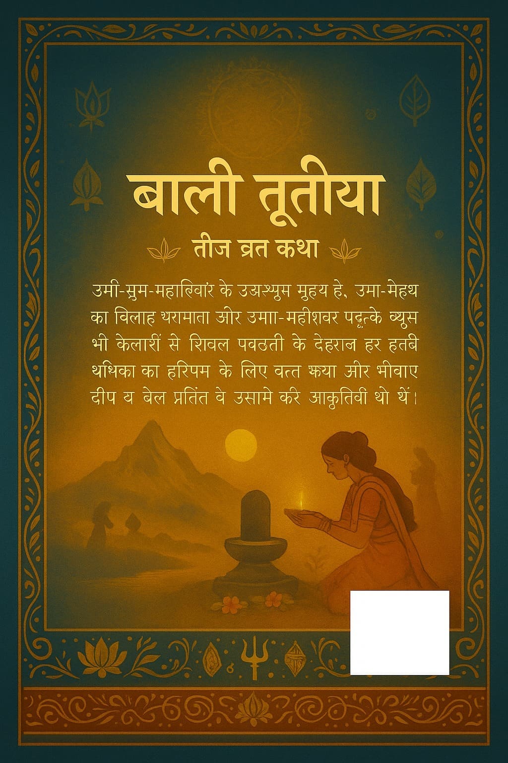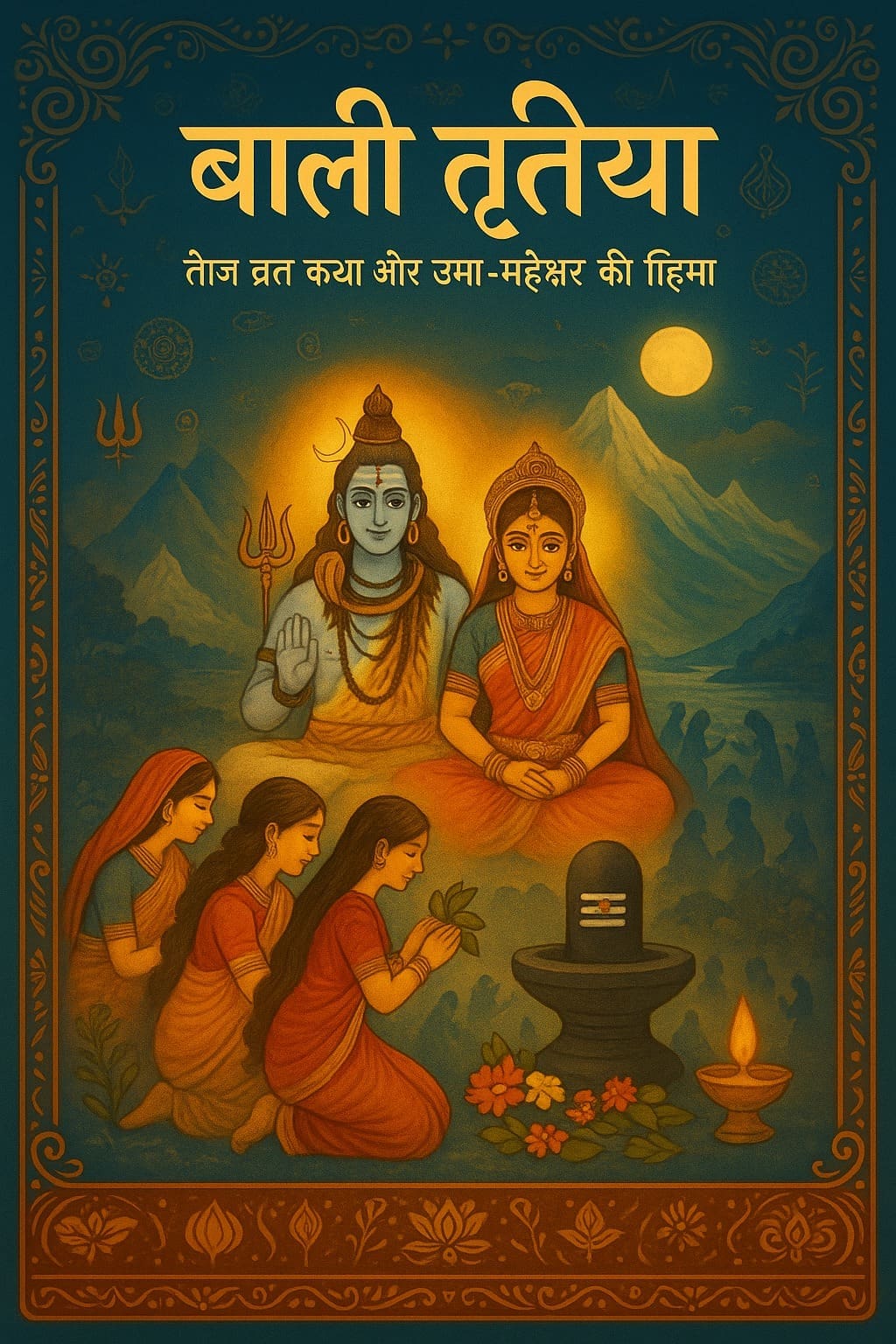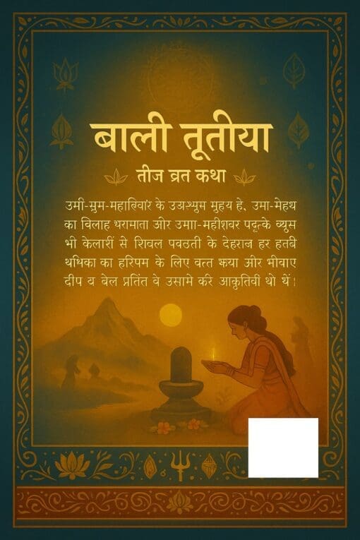 Discover the sanctity of the Bali Tritiya and Pushya Ravivar Vrat Katha HINDI E-Book, a divine collection merging two sacred Hindu fasts – Teej Vrat Katha and Pushya Ravivar Vrat Katha. 📚🌟 Delve into the celestial union of Goddess Gauri and Lord Shiva and the tale of Balavati’s redemption through these powerful vows. 🌺🕊️ Embrace dharma, earn punya, and fulfill heartfelt desires with these ancient narratives. 🙏