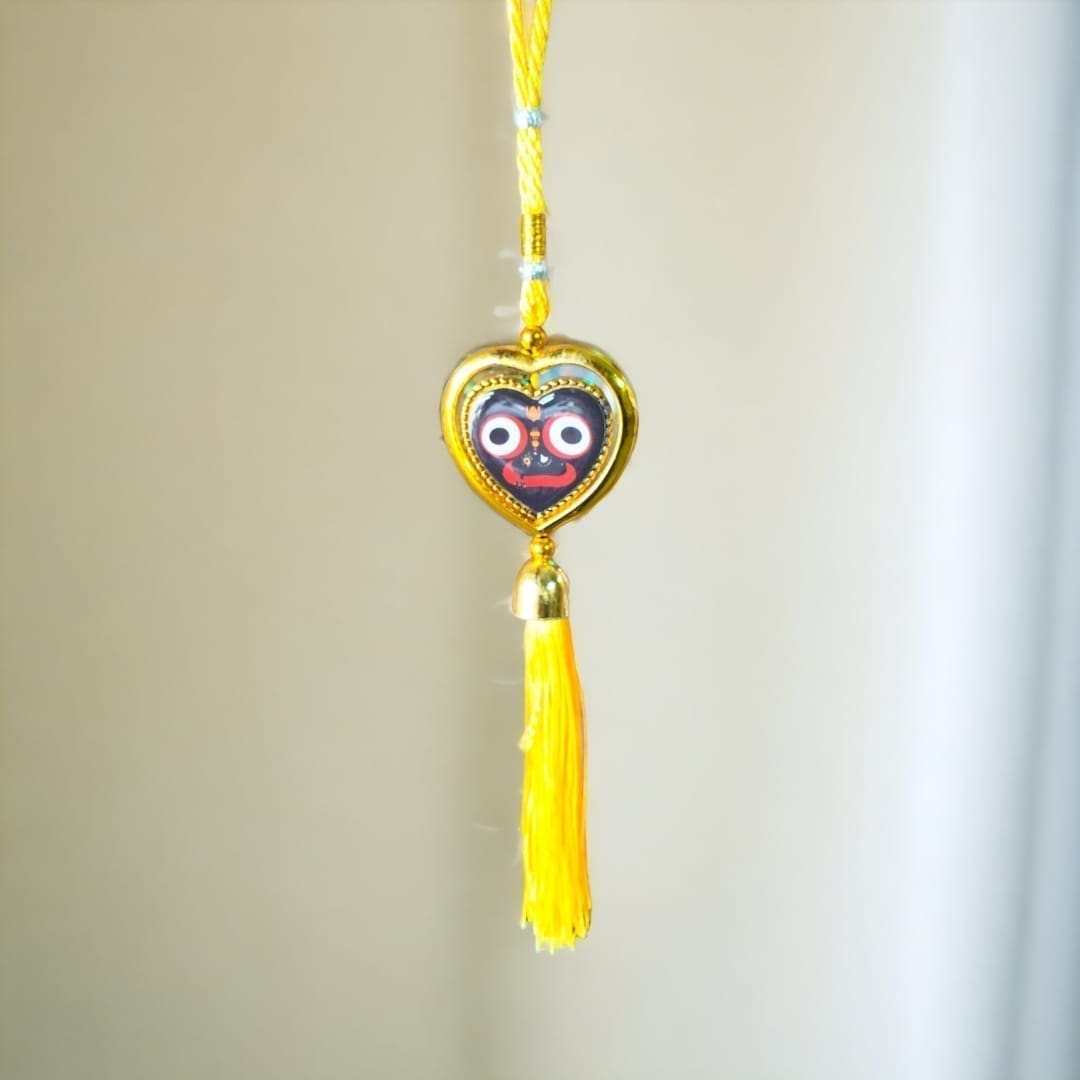A masterpiece of artistry, this handcrafted jhumar showcases intricate patterns and vibrant colors, a testament to the artisans’ skill and dedication. Featuring Lord Jagannath in traditional attire, it exudes divine grace and positivity.