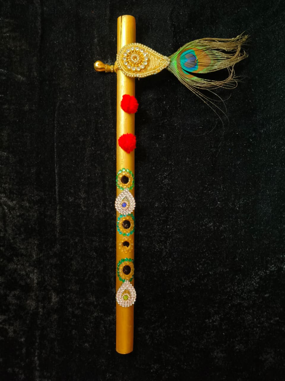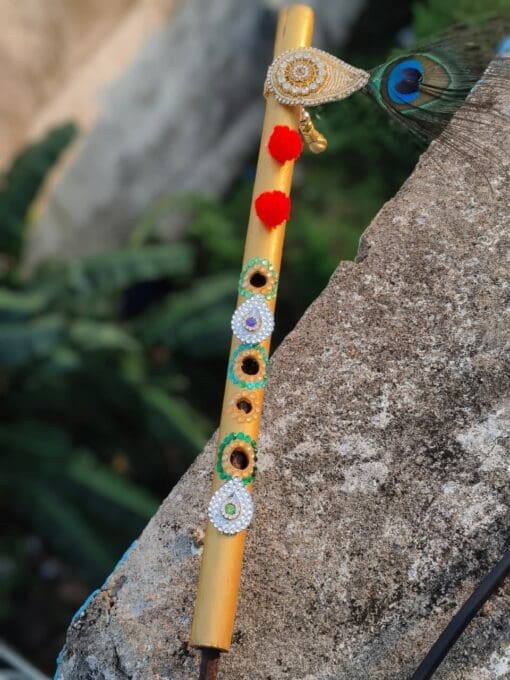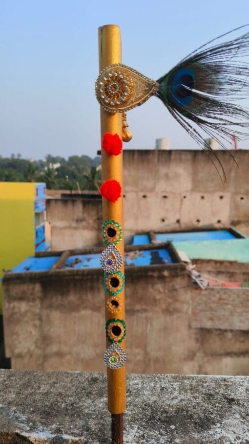 Handcrafted from fine wood, this 14-inch Divine Flute is a sacred accessory adorned with mirrors, stones, and colorful threads, adding a touch of elegance to your worship. π