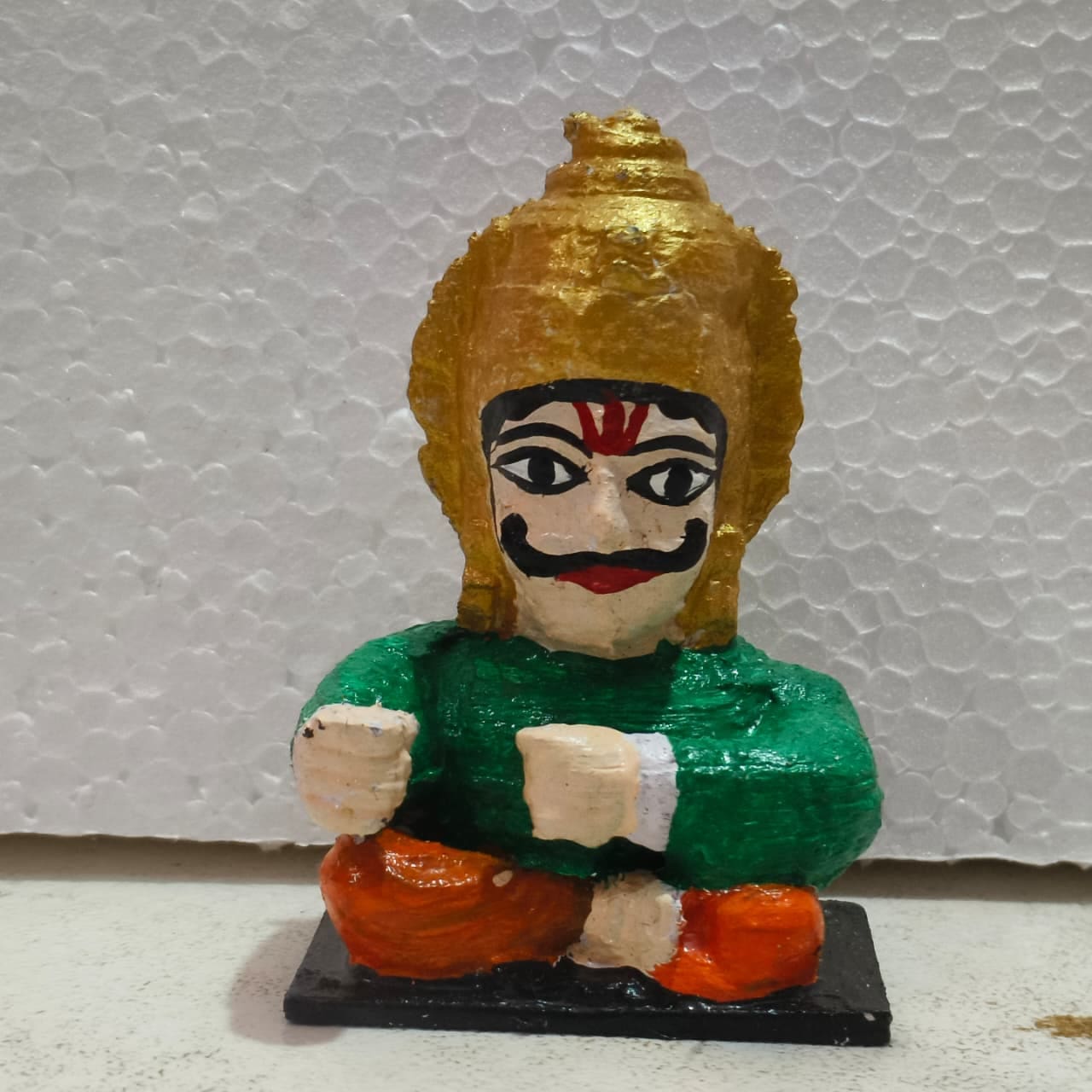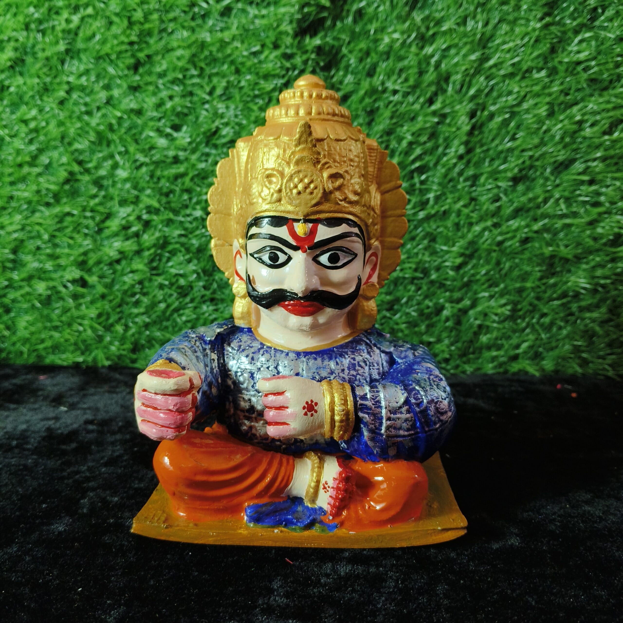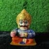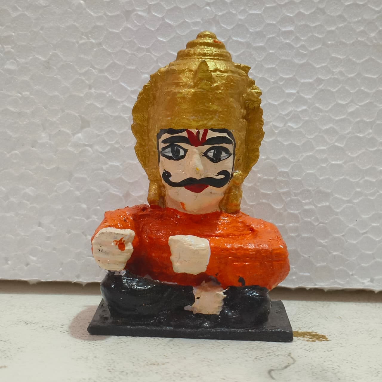 Vibrant Finish: Painted in high-contrast colors with a shimmering blue and silver tunic, bright orange dhoti, and a striking facial expression featuring a traditional mustache and bold, protective eyes.