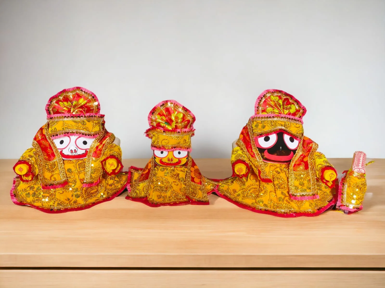Premium Mukut Set for Lord Jagannath, Balabhadra, and Subhadraโregal headwear for divine adornment. ๐๐ Crafted with intricate detail from luxurious velvet fabric, these crowns add elegance and devotion to your home altar or temple.