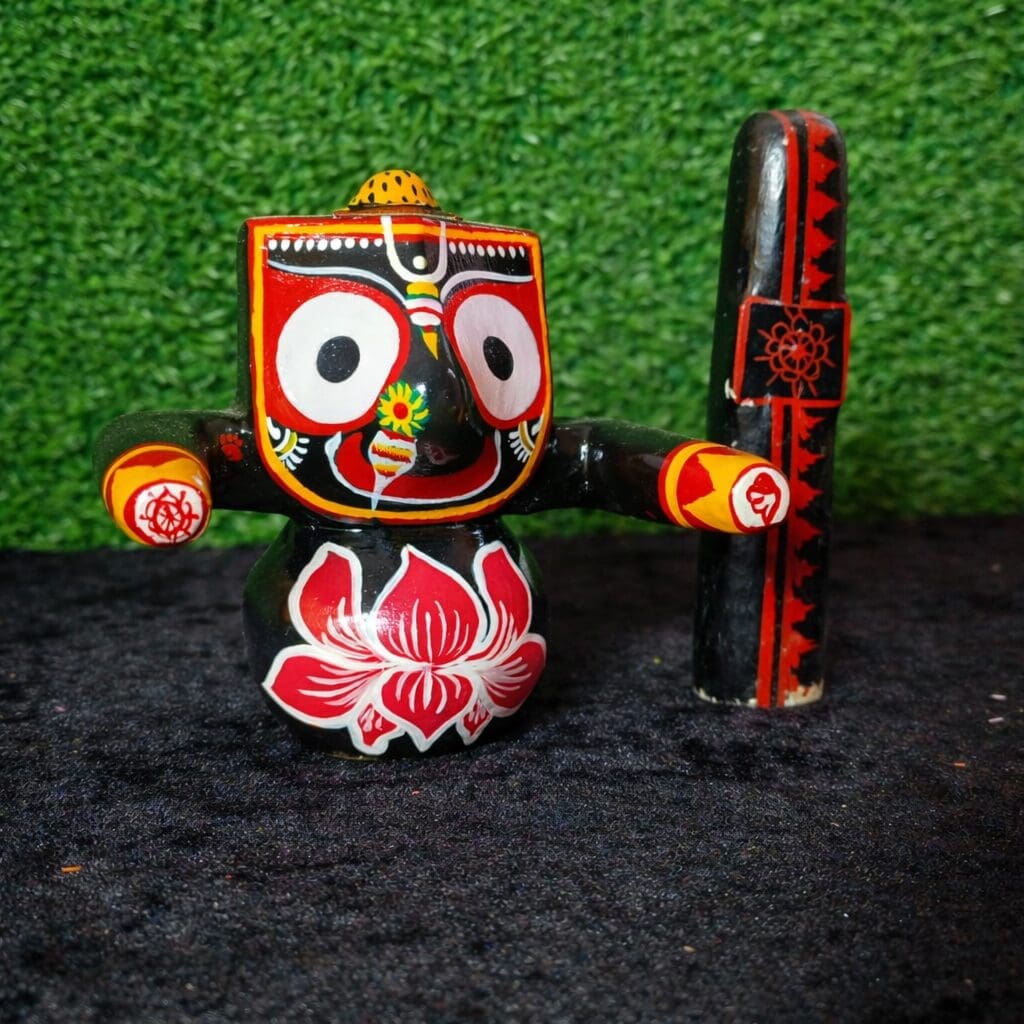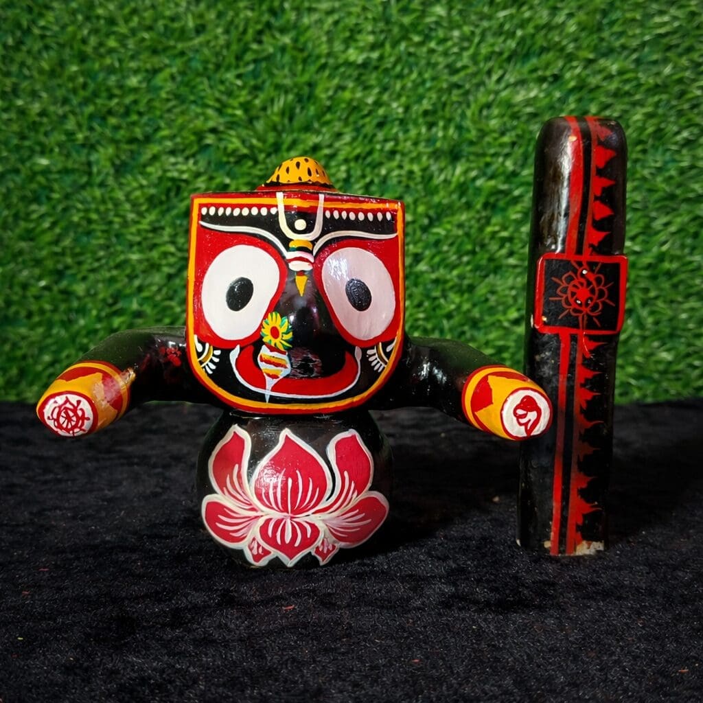 The Offering : This singular, exquisite masterpiece depicts Lord Jagannath arising from a vibrant, hand-painted red lotus base. Meticulously detailed with high-contrast traditional colors and sacred symbols, the idol rests on a high-quality base with a smooth, premium finish. The deep black hue of the Lord contrasts beautifully with the multi-colored lotus, creating a lasting, temple-like glow for your personal space.