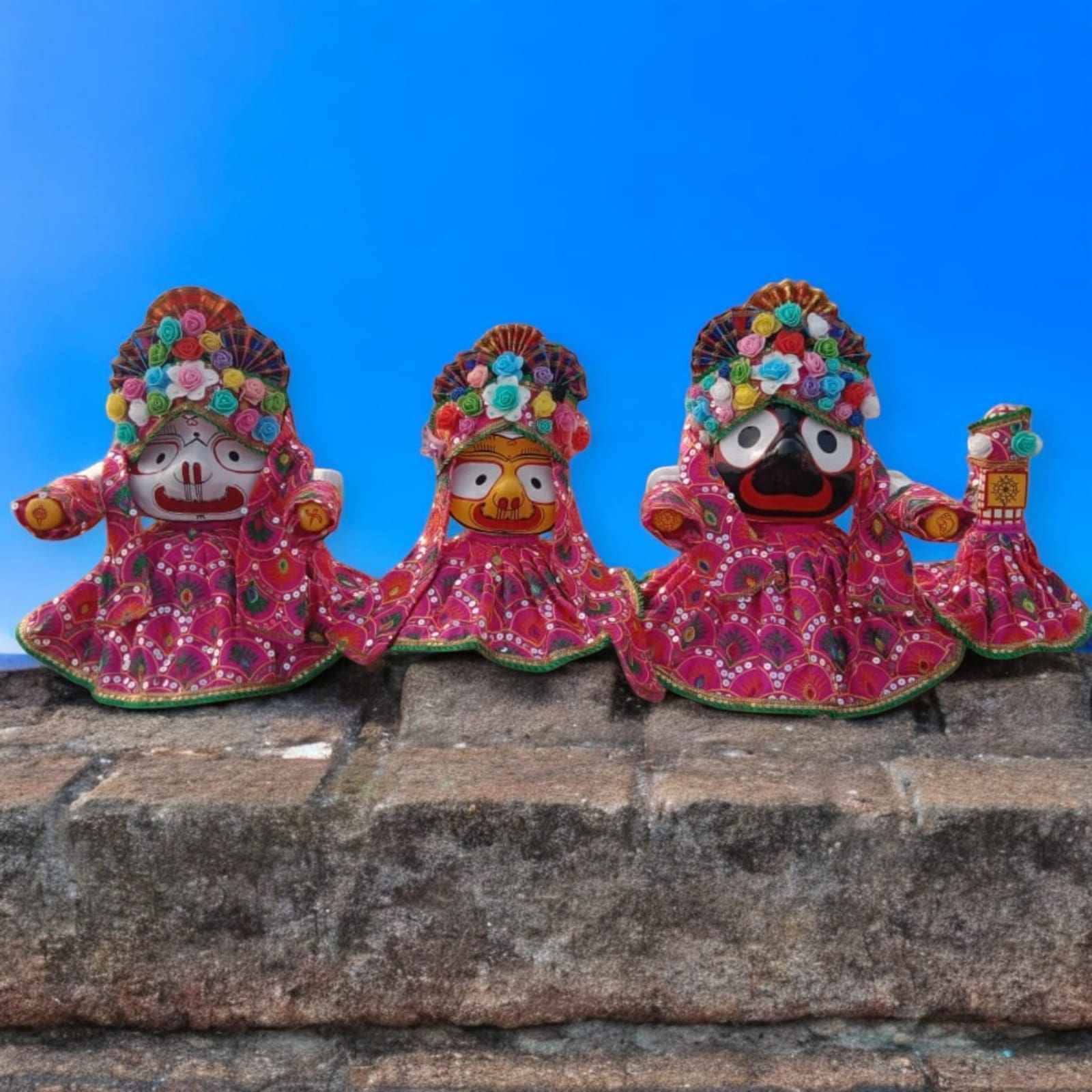 Adorn your deities in this exquisite Premavardhani Dress set, complete with Flower Mukut, to enhance your home temple’s divine ambiance. 🌺✨ Crafted from high-quality silk pata cloth, this 15-piece set in a beautiful deep pink exudes luxury and vibrance, perfect for Lord Jagannath, Balabhadra, and Subhadra murtis. 🙏