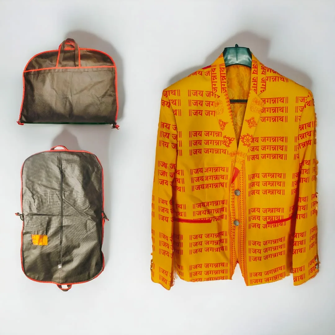Easy to care for, this blazer comes with complementary Nirmalya Mahaprasadam and Sanjua for 30 days, enhancing its spiritual significance. Wear it to special occasions, temple visits, or daily activities to express your faith and connect with like-minded devotees.