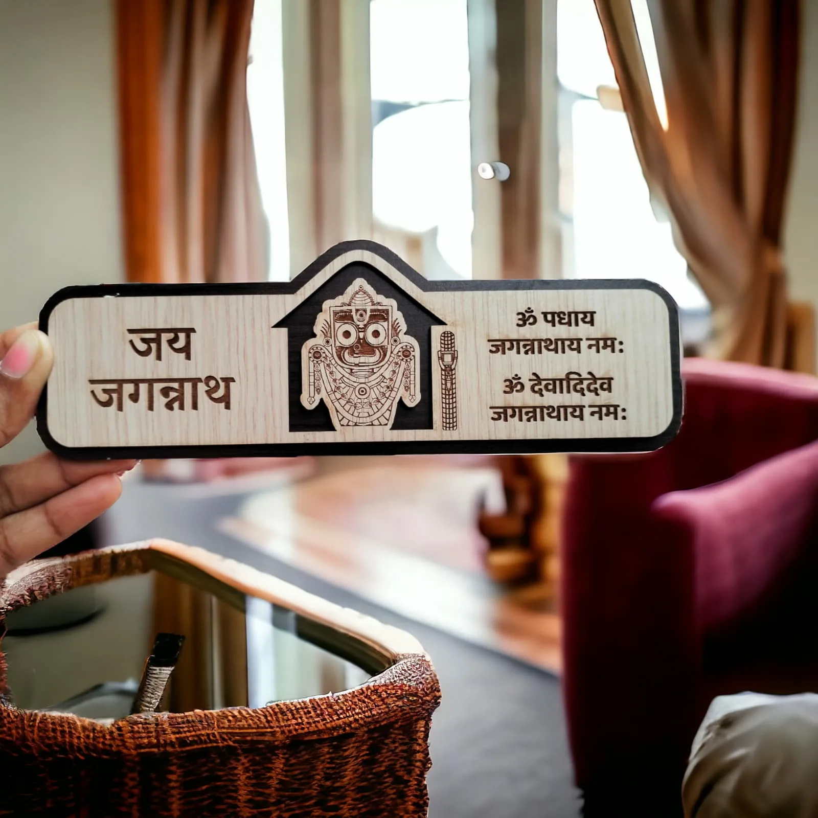 This name plate features the sacred name of Lord Jagannath, a beloved deity in Hinduism who represents compassion, protection, and abundance. Displaying his name at your entrance is believed to bring blessings and positive energy into your home.