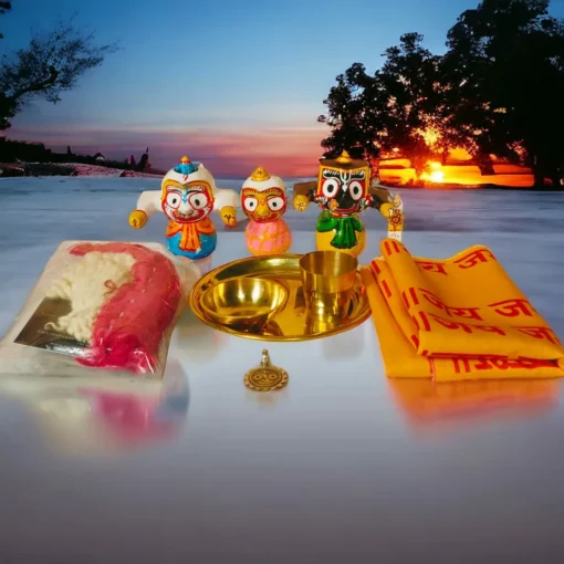 This hamper features a 2-inch handcrafted neem wood Shri Jagannath murti with Sudarshan Chakra, a beautiful silver locket, essential brass puja items, and a Jagannath cloth for rituals. πΏ Your purchase includes Nirmalya Mahaprasadam, Sanjua for 30 days, a premium murti dress set, and a Shri Jagannath Pujan Padhhati. ποΈ