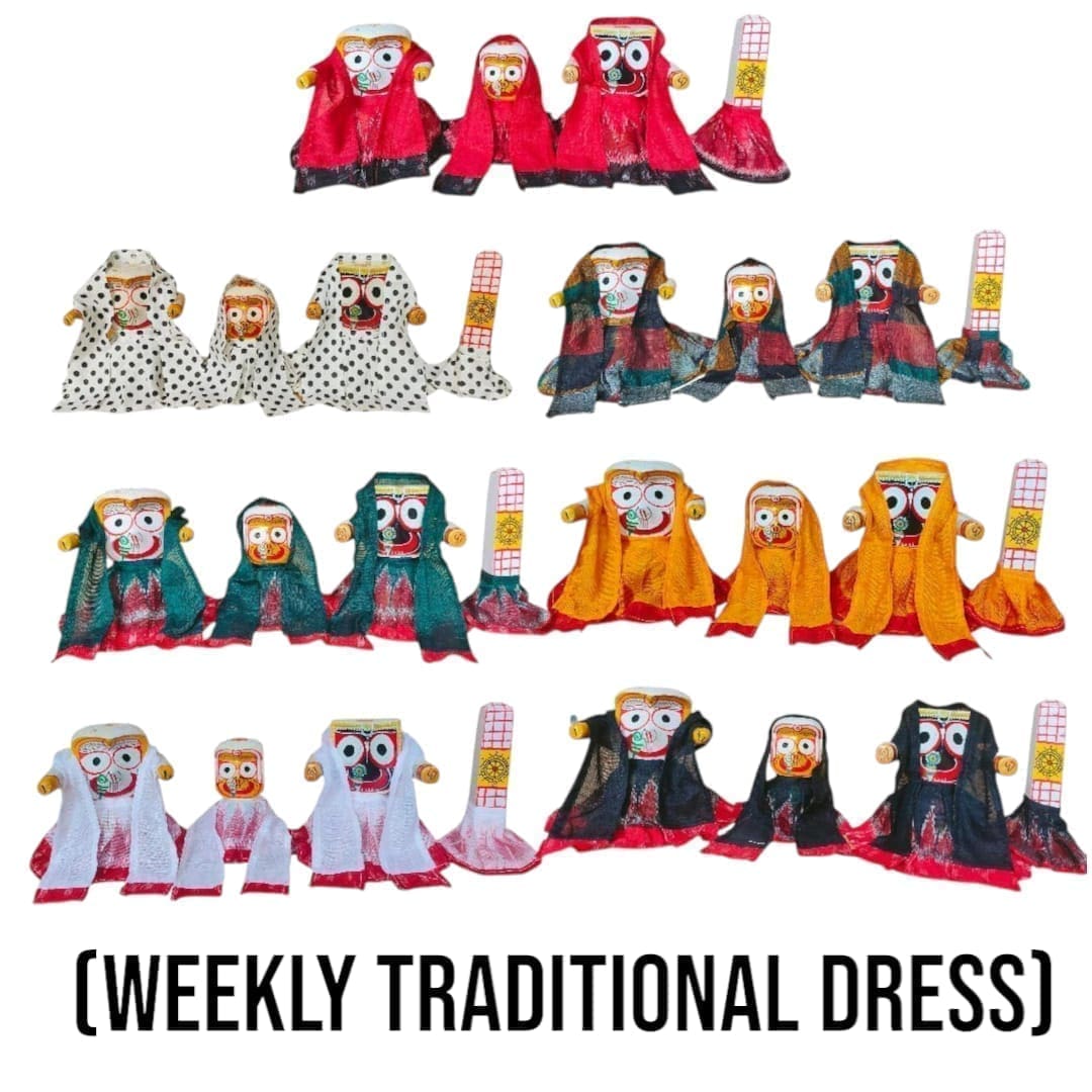 Each set incorporates the specific colors associated with the ruling deity of the day, as followed in the Shri Mandir: Sunday (Red), Monday (White), Tuesday (Red/Pink), Wednesday (Green), Thursday (Yellow/Gold), Friday (White), and Saturday (Black). Available in various sizes to fit your Jagannath murtis perfectly. 🛍️