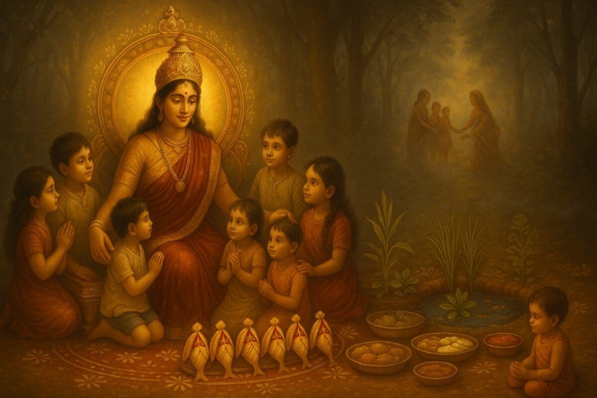 Hearing this, the Sadhabani recognized the goddess and narrated her entire past story, one detail at a time. The goddess then returned her five sons and said, “I had stolen your five sons. Take them now. Never again in your life steal anything that belongs to another, and observe a fast for ‘Kanji Aonla’ on the day after Ashtami in the month of Margashira. Your sons will be blessed with well-being.”
