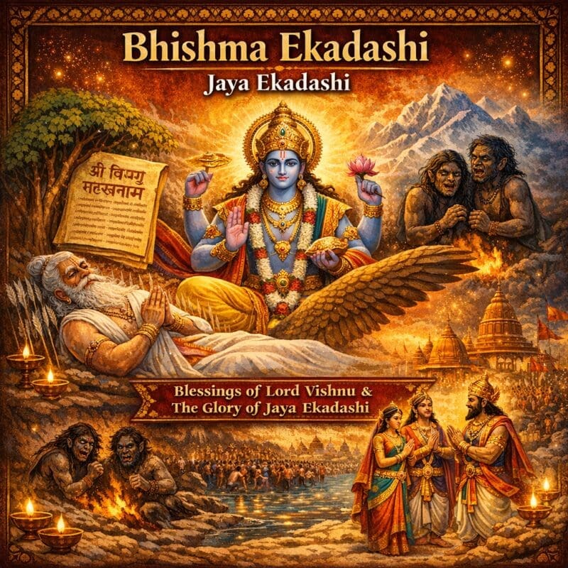 The Ekadashi falling in the bright fortnight (Shukla Paksha) of the month of Magha is celebrated as Bhishma Ekadashi. It is also known as Jaya Ekadashi or Bhaimi Ekadashi. It is said that the Vishnu Sahasranama Stotram (the thousand names of Lord Vishnu) was born on this very day. By fasting on this day, remembering Bhishma Pitamah, and chanting the Vishnu Sahasranama throughout the day, one receives the blessings of the Almighty. Lord Vishnu is worshipped and offered prayers on this occasion. Among the many auspicious bathing days of the “Maha Kumbha” period—such as Makara Sankranti, Magha Purnima, and Maha Shivaratri—Bhishma Ekadashi is considered a holy day for the Kumbha Snana (sacred bath).