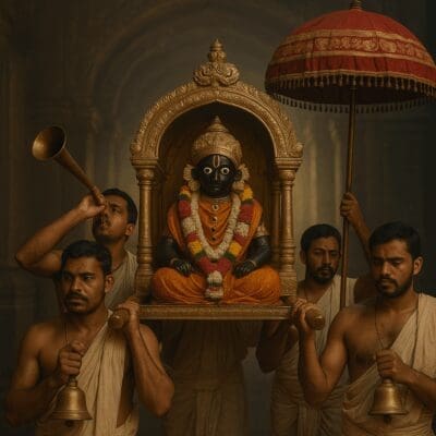 After the Shodasha Upachara Puja (worship with sixteen services) is finished and Karpura Alati (camphor waving) is done, the Parsva Parivartana Niti (ritual of changing sides) is performed. The Mudirasta, Behera Khuntia, Garabadu, Palia Mekapa, Akhanda Mekapa, and Tadhau Karana sevakas climb up to the Khata Sheja (sacred bed) using a ladder. After breaking the seal, the Mudirasta opens the box containing the Shayana Thakura (sleeping deity). Taking sanctified water (Hatuani) from the Garabadu, he offers Pushpanjali (flower offering) three times with white flowers provided by the Behera Khuntia in a silver bowl. Then, the ritual of turning the sleeping deity’s side (Kada Leuta Niti) is performed. During this time, the Mudirasta performs Bandapana. After this, the box is closed, the doors are sealed, and they descend. The six sets of gold ornaments worn by the deities on the Ratnasimhasana are removed (Mailama), and they are offered betel nuts (bidia), ghaza, and paida. They are then taken to the bed chamber for their slumber (Pahuda).