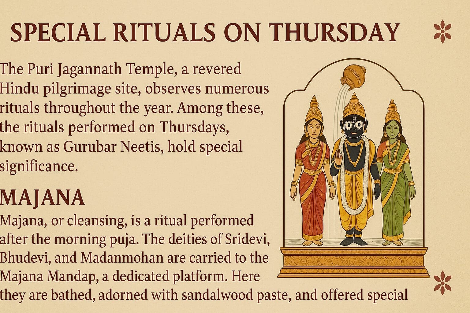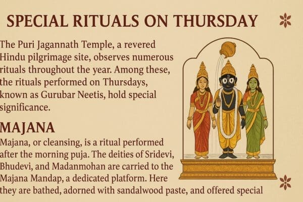 The Puri Jagannath Temple, a revered Hindu pilgrimage site, observes numerous rituals throughout the year. Among these, the rituals performed on Thursdays, known as Gurubar Neetis, hold special significance. These rituals are primarily categorized into two: Majana and Ekanta.