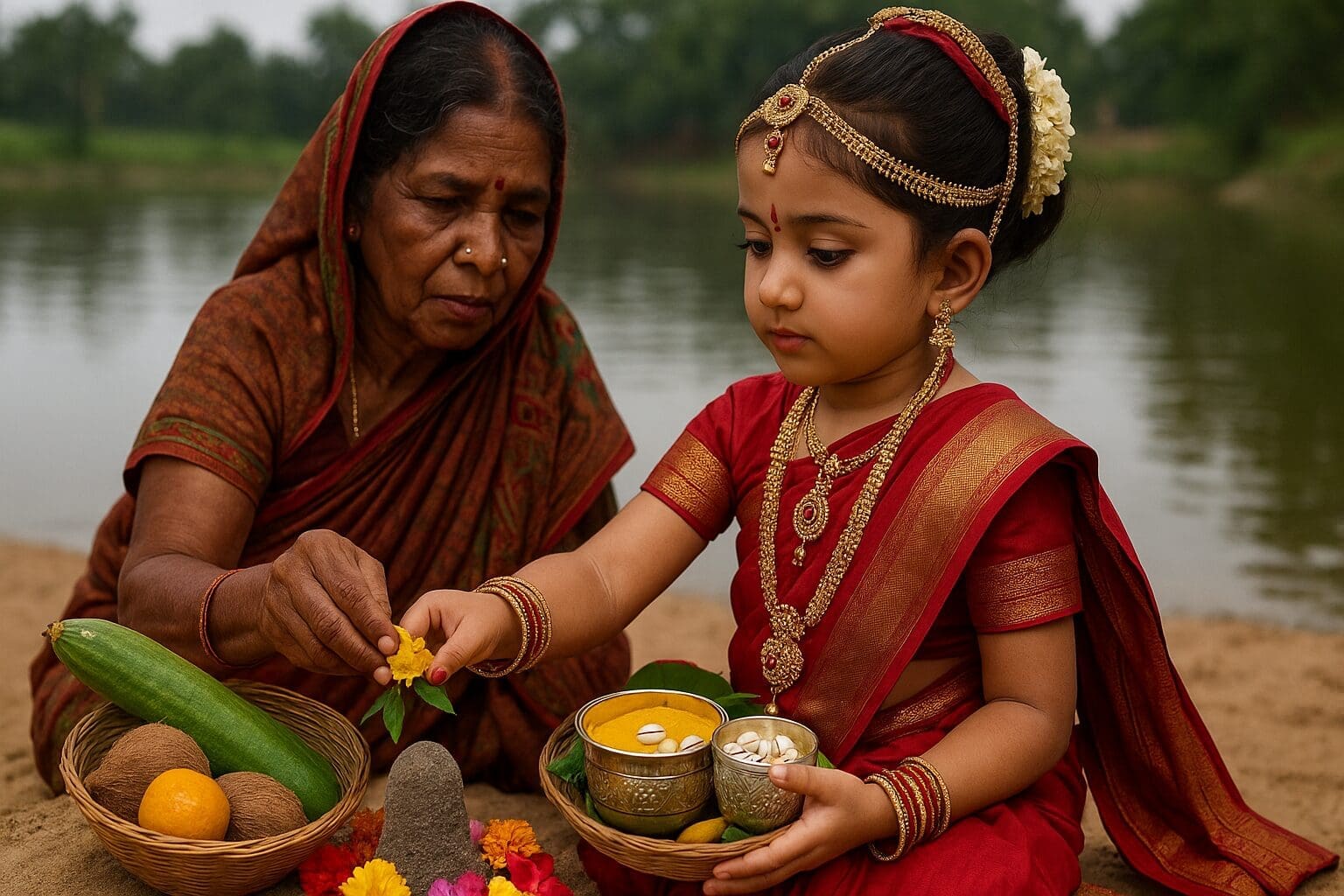 From Ashwina Shukla Panchami to Ashtami, these little girls become ‘Neta’. They dress up in traditional attire. They wear a silk saree (Pata Luga) in the ‘Kachha’ style and adorn themselves with various traditional ornaments. In one hand, they hold a silver box (karata) containing turmeric powder, cowrie shells, and a betel nut for the Balipuja. In another basket (tokai), they carry items like ridge gourd (janhi), orange, cucumber, coconut, sacred thread (paita), and turmeric. Accompanied by an elder female relative like a grandmother or an aunt, they proceed to the Markandeshwar pond. There, they make a Shivalinga from sand and worship Hara-Gauri (Shiva and Parvati).