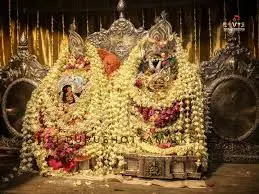 Subsequently, the Bar (groom – Lord MadanMohan) and kanya (bride – Goddess Devi) are crowned with jewels and a Bandapana (salutation) is performed. After the Bandapana ritual is completed, the Azjamala (garland) is presented to the Bar and Kanya, and the Mahajan Sevaks (chief servants) perform Bijay (victory) and place them on the Palinki (ceremonial palanquin) near the Jhulan Mandap (swing pavilion).